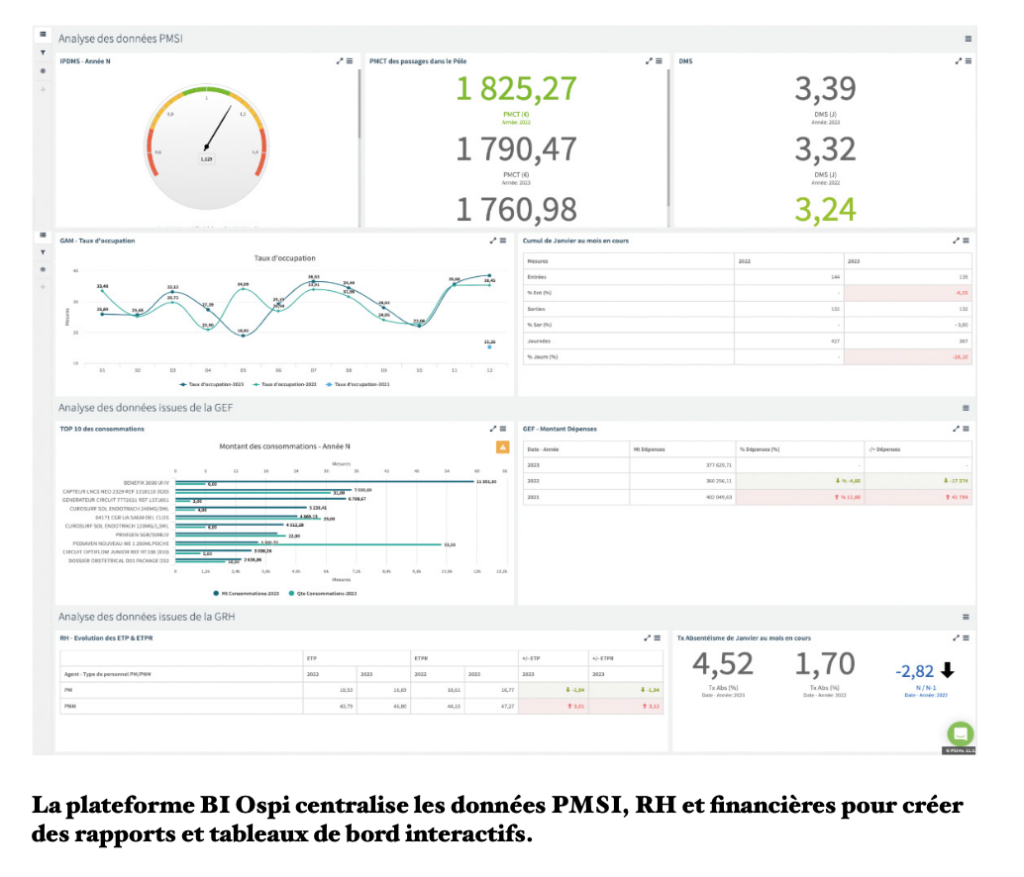 La plateforme BI Ospi centralise les données PMSI, RH et financières, permettant de créer des rapports et tableaux de bord interactifs, d’effectuer des analyses croisées et d’automatiser les exports ou l’envoi de rapports par email. Elle facilite la valorisation des données hospitalières et soutient la prise de décision stratégique, à l’échelle locale comme territoriale. Les tableaux de bord de pôles, quant à eux, traduisent ces données en indicateurs opérationnels pour les chefs de service et responsables de pôles, offrant une vision consolidée de l’activité et des leviers d’amélioration médico-économiques. Ensemble, ces solutions forment un écosystème intégré, alliant IA, performance et fiabilité, pour améliorer le codage, assurer une juste valorisation des séjours et simplifier le quotidien des équipes DIM.