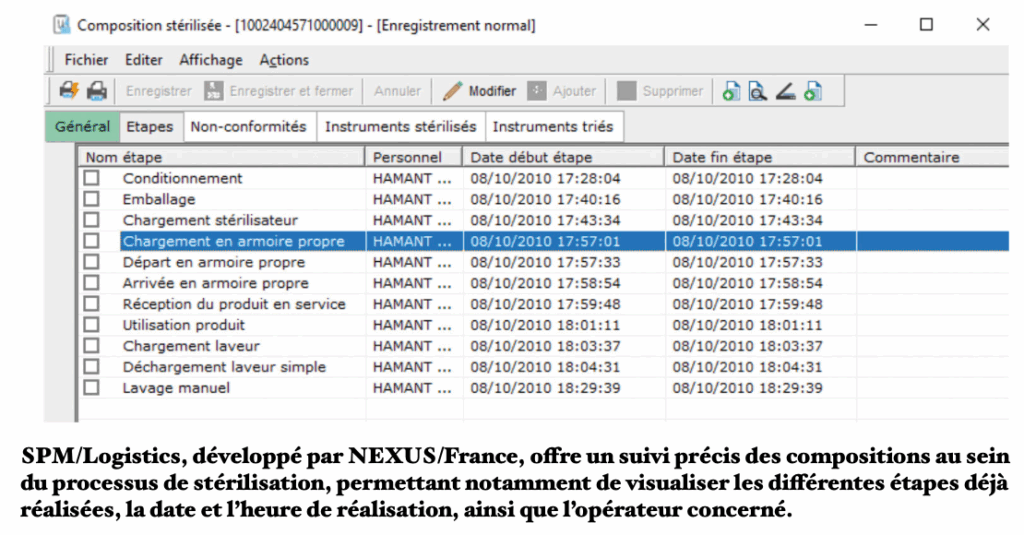 SPM/Logistics offre une traçabilité complète du processus de stérilisation, permettant de suivre en temps réel l’emplacement des compositions et d’identifier les points d’amélioration grâce à des statistiques détaillées. Des contrôles rigoureux garantissent la fiabilité et la cohérence du processus, depuis le chargement des dispositifs stériles dans les armoires de transport jusqu’à leur retour après utilisation au bloc opératoire, tandis qu’une communication fluidifiée entre sites assure une coordination optimale. Cette approche permet non seulement de visualiser chaque étape de la stérilisation, mais aussi d’optimiser continuellement l’efficacité logistique.