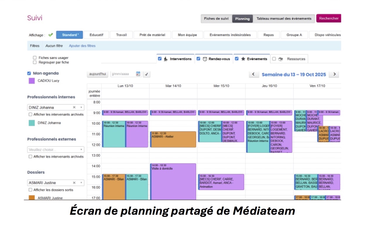 - PPA (Projet Personnalisé d’Accompagnement) : structure et formalise l’accompagnement en lien avec les besoins et attentes de l’usager. Écran de planning partagé de Médiateam