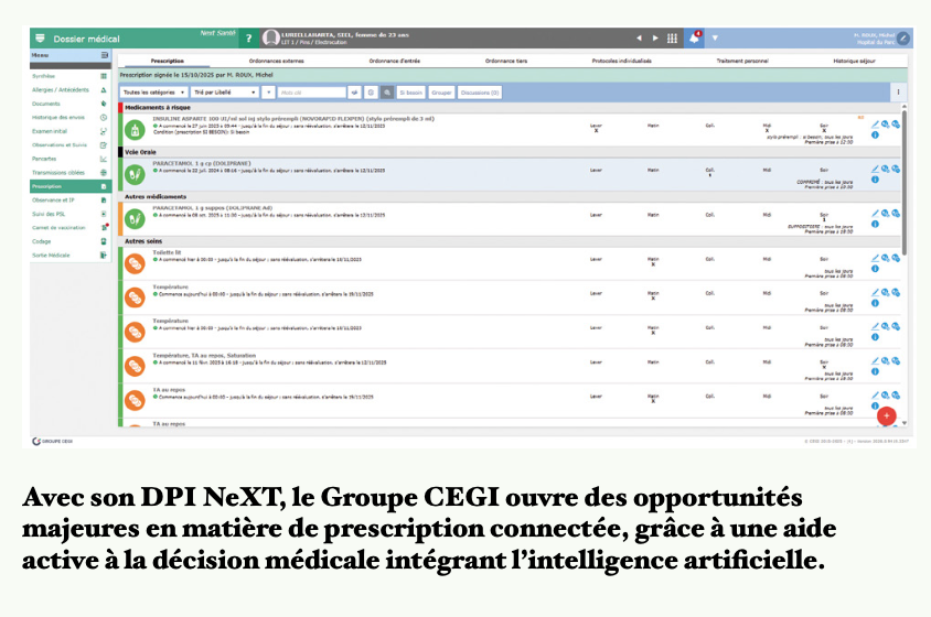 Avec le Groupe CEGI, la transformation digitale répond concrètement aux enjeux quotidiens des établissements de santé avec des solutions innovantes, intuitives et pensées pour les besoins des professionnels sur le terrain. Le DPI NeXT offre ainsi une gestion fluide du parcours de soins, grâce à une vision à 360° via une timeline interactive centralisant l’historique des soins, les prescriptions et les comptes rendus. Full web et ergonomique, il a été conçu avec les utilisateurs. La prescription en particulier a été co-construite en agilité avec les praticiens experts de différents services pour répondre parfaitement à leurs besoins et pratiques. Elle y gagne une fluidité et une lisibilité optimales sans perdre sa structuration totalement compatible avec le CISIS. La qualité de la prise en charge est garantie par la continuité de l’information et son partage total entre les praticiens, depuis l’annonce jusqu’aux courriers de sortie. Traitement personnel, prescription hospitalière et prescription de sortie sont collectés au meilleur moment, auprès du meilleur praticien et rendus disponibles partout et pour tous.