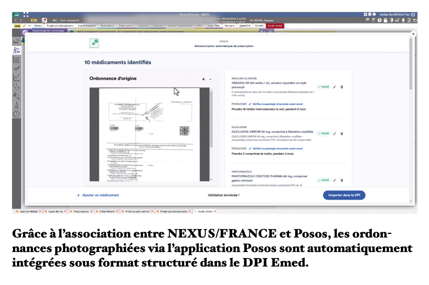 Éditeur du dossier patient informatisé Emed, NEXUS/FRANCE enrichit constamment sa solution avec des fonctionnalités innovantes, développées en interne ou par des partenaires, pour simplifier le quotidien des équipes médico-soignantes et favoriser de nouveaux usages. Dans un contexte hospitalier où le temps est précieux et les risques médicamenteux élevés, il a de longue date identifié la prescription connectée comme un levier essentiel pour renforcer la sécurité des soins. Ainsi, Emed intègre des contrôles Vidal en temps réel sur les interactions médicamenteuses, les états physiopathologiques et les allergies, proposant des alertes sur les risques iatrogènes, de surdosage ou de redondances. Pour aller plus loin et améliorer encore l’efficacité des pratiques, NEXUS/FRANCE s’est associé à Posos, la Medtech amiénoise spécialisée dans l’intelligence artificielle appliquée au circuit du médicament, afin d’intégrer directement dans Emed la reconnaissance automatique des ordonnances et leur retranscription instantanée en format structuré.