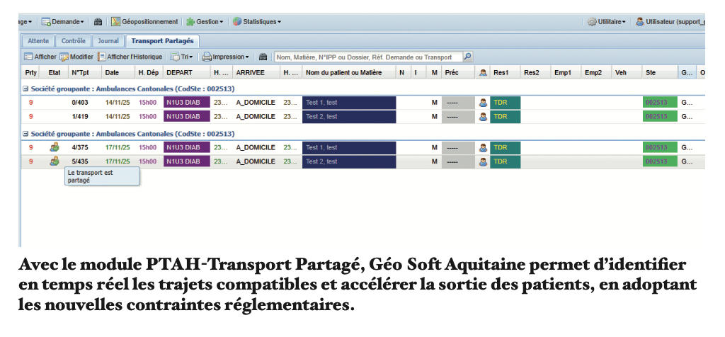 PTAH-CRTE, sa plateforme de gestion des transports externes – qu’ils soient pris en charge par l’établissement ou par l’Assurance Maladie – se distinguait déjà par sa capacité à centraliser les demandes via un formulaire unique, à en assurer la traçabilité et à automatiser l’orientation des prises en charge, offrant une vision globale et structurée de la chaîne de transport. Dans cette continuité, Géo Soft Aquitaine a fait évoluer le module PTAH-Transport Partagé afin d’intégrer les nouvelles règles et tarifications liées aux évolutions réglementaires. En identifiant en temps réel les trajets compatibles, il optimise le remplissage des véhicules, limite les déplacements inutiles et contribue à la maîtrise des coûts, tout en maintenant la qualité de prise en charge des patients. Enfin, PTAH-Infact complète cet écosystème en valorisant les transports réalisés, en générant la commande côté hôpital et en permettant, in fine, un rapprochement automatique des prestations réalisées et des factures transmises par les sociétés de transport sanitaire.